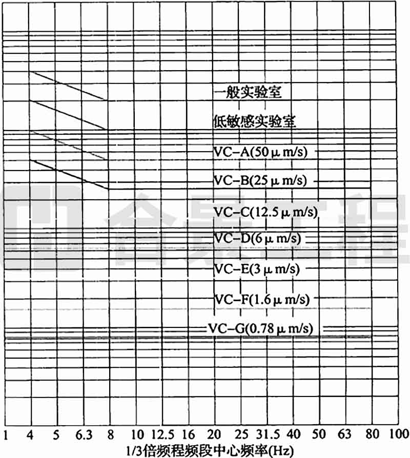 A.0.1 拉絲塔的容許振動(dòng)參數(shù)可按精密設(shè)備、儀器容許振動(dòng)通用標(biāo)準(zhǔn)曲線(xiàn)(圖A.0.1)中VC-B(25μm/s)曲線(xiàn)確定。