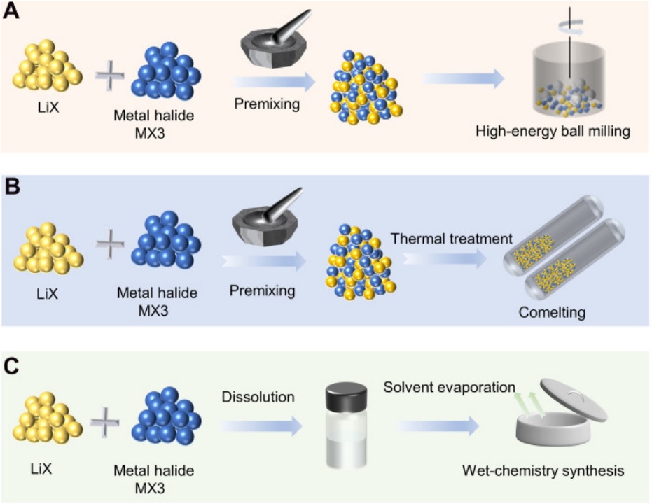 目前,當(dāng)前鹵化物固態(tài)電解質(zhì)的合成主要采用機(jī)械混合球磨和高溫?zé)Y(jié)路徑,采用其他的合成方法,如液相合成、氣相沉積等,報道的相對較少。