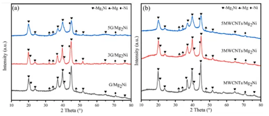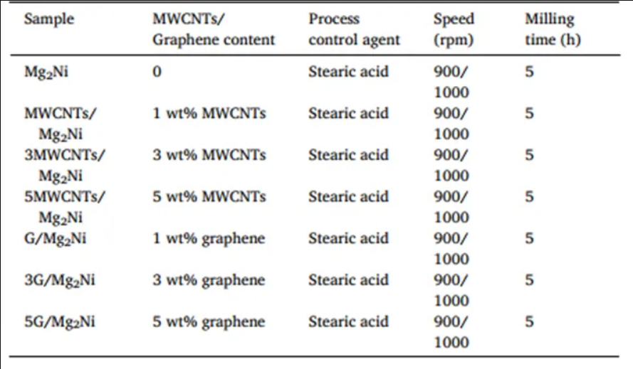 首先稱取45.3g鎂粉、54.7g鎳粉和3g硬脂酸(用作過程控制劑)。為了平衡Mg在球磨過程中的損失,額外添加4wt %的Mg,然后均勻混合并放入高能球磨機中。為了防止球磨過程中的氧化,在氬氣保護氣氛下進行了研磨。球料比為15∶1,采用3mm不銹鋼球,球磨機以900r/min和1000r/min的速度交替運行,研磨時間為5h。在球磨過程中使用循環(huán)冷卻方式,使球磨腔溫度維持在35℃左右。使用石墨烯和MWCNTs對Mg2Ni合金進行復(fù)合改性。