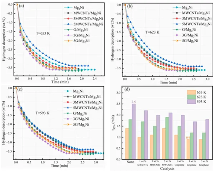 MWCNTs和石墨烯的結(jié)合有效地降低了Mg2Ni合金放氫反應(yīng)所需的活化能,從而提高了放氫動力學(xué)效率。特別值得注意的是,在3wt%石墨烯復(fù)合材料中,激活能最低為58.7kJ/mol,與Mg2Ni合金相比降低了約10kJ/mol。這突出了合金放氫動力學(xué)最有效的增強。