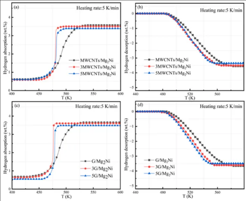 當(dāng)添加量為3wt%時表現(xiàn)出最佳的吸氫性能,在475K的溫度下,在200s內(nèi)迅速達到吸氫的飽和狀態(tài),在達到吸收溫度后表現(xiàn)出穩(wěn)健的吸氫動力學(xué)。隨著5wt%MWCNTs的引入,放氫飽和溫度為545K,放氫速率也略有上升。與MWCNTs樣品相比,3G/Mg2Ni在476K左右表現(xiàn)出更冷的吸氫量,具有更強的動力學(xué)特性,可以在150s內(nèi)快速達到吸氫飽和。